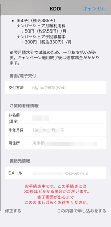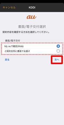 契約内容の確認方法について、「My auで確認(Web)」または、「ご契約住所に書面でお届け」のいずれかを選択し、[次へ]をタップします。