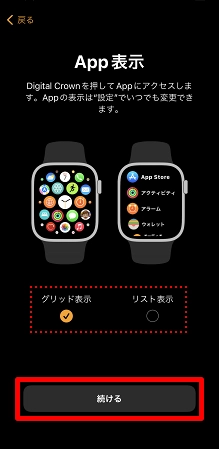 「グリッド表示」または「リスト表示」を選択し、[続ける]をタップします。