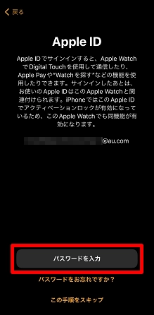 iPhoneのApple IDのパスワード入力画面が表示されますので、[パスワードを入力]をタップします。