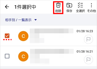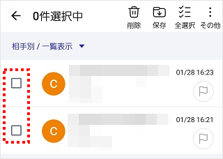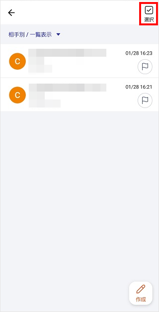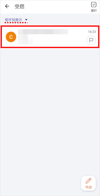 表示方法が「相手別表示」になっていることを確認し、削除するメールの差出人名をタップします。 ※差出人のメールをすべて削除したい時は、[選択]から対象の差出人名をタップ後、[削除]をタップします。