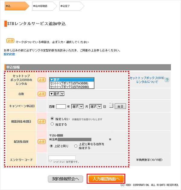 「申込情報」欄でレンタルを希望するセットトップボックス(STB)を選択し、必要箇所をご入力の上[入力確認画面へ]をクリックします。