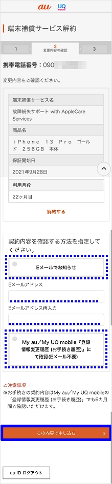 My au(Web)で、「故障紛失サポート ワイド with AppleCare Services & iCloud+」「故障紛失サポート with AppleCare Services & iCloud+」「故障紛失サポート with AppleCare Services」を退会できます。