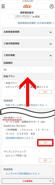 「端末補償サービス」欄の解約する補償サービスを確認し、[変更]をタップします。