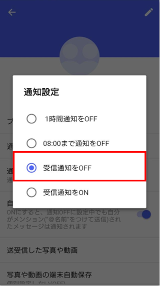 [受信通知をOFF]をタップします。 ※一時的に通知を消したい場合、[1時間通知をOFF]もしくは[08:00まで通知をOFF]をタップします。