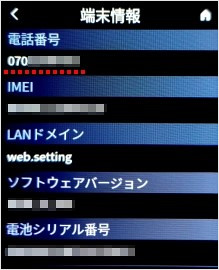 [▲]か[▼]を押して「端末情報」を選択すると、画面左側に電話番号が表示されます。 ホーム画面に戻るには[●(電源・決定ボタン)]を押します。