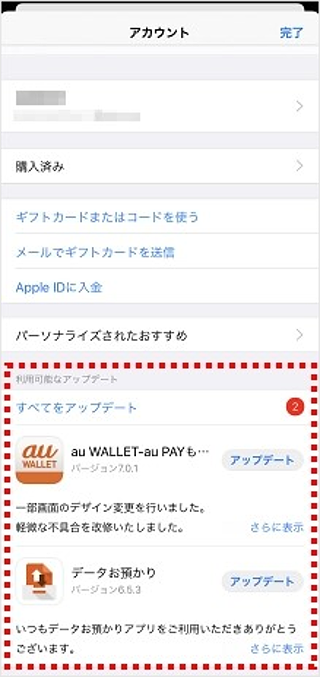 アプリのアップデートがある場合、アカウント画面の下部に「利用可能なアップデート」欄が表示されます。