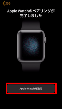 「Apple Watchのペアリングが完了しました」と表示されたら、続いて[Apple Watchを設定]をタップします。 ※今までにApple Watchのペアリング設定をしていた場合、 [バックアップから復元]をタップ→復元するバックアップを選択→[続ける]をタップの順で操作を行い、手順8へ進みます。