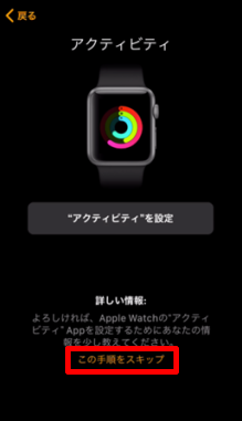 Apple Watchのアクティビティの設定をします。 ※ここでは[この手順をスキップ]をタップします。