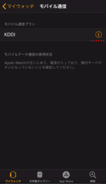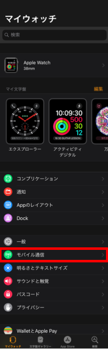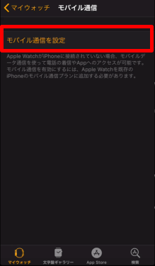 スクロールして、[モバイル通信]をタップします。 ※Apple Watch Series 3以降のCellularモデル以外では、ナンバーシェアに対応していないため、「モバイル通信」の項目は表示されません。