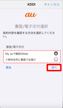 契約内容の確認方法を選択し、[次へ]をタップします。