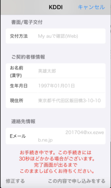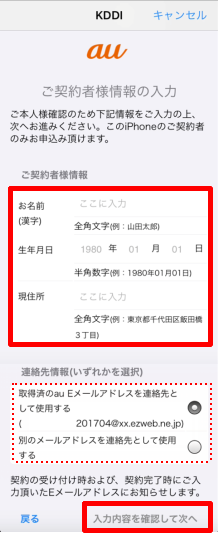「ご契約者様情報」と「連絡先情報」を入力・選択し、[入力内容を確認して次へ]をタップします。 ※「ご契約者様情報」の入力内容が間違っていると処理が完了せずエラー画面が表示されます。My au(Web)をご確認いただき、「お客様登録情報」の通りにご入力ください。