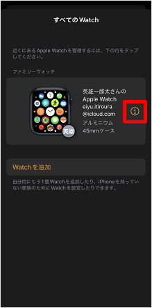 ペアリングを解除するApple Watchの右端の[i]マークをタップします。