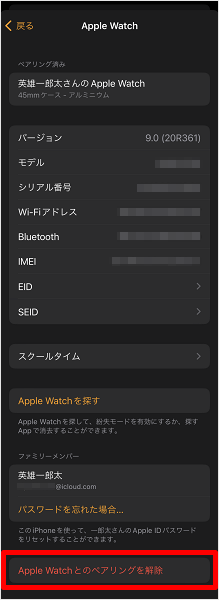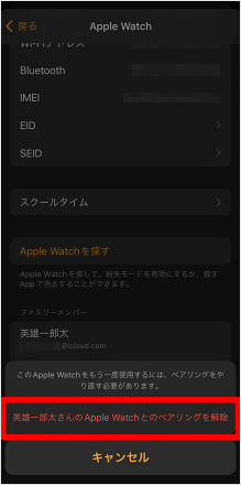 画面最下部の[Apple Watchとのペアリングを解除]をタップします。