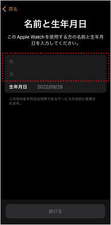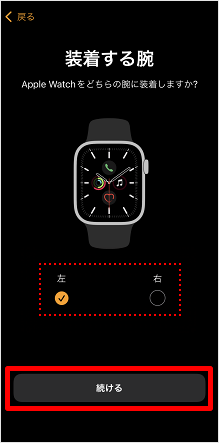 Apple Watchを装着する腕を選択します。[左]または[右]をタップして選択し、[続ける]をタップします。