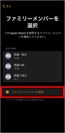 Apple Watchを利用するファミリーメンバーを選択します。または、新たにメンバーを追加することもできます。