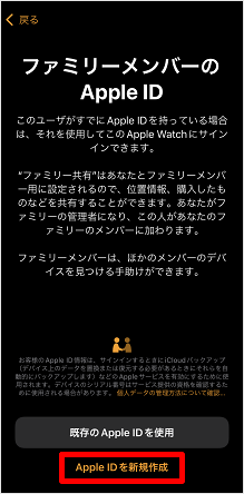 既存のApple IDを使用するか、または新規作成するかを選択します。