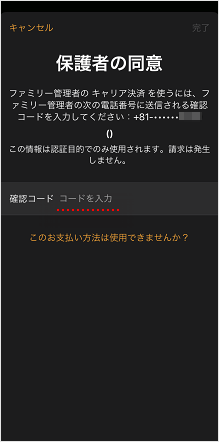 保護者の同意を求める画面が表示されます。お支払い方法にキャリア決済を設定している場合は、確認コード入力画面が表示されます。