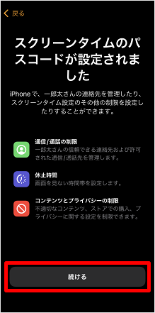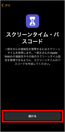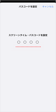 スクリーンタイム・パスコードを数字4桁で設定します。