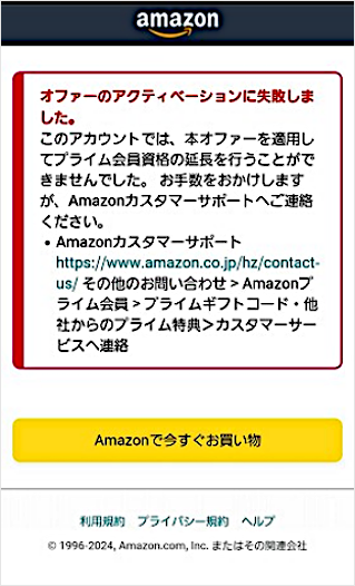 各種キャンペーンなど(弊社主催以外も含む)で受け取られたAmazonプライムギフトコードを適用中の場合、「オファーのアクティベーションに失敗しました。」と表示されることがあります。