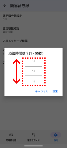 簡易留守録が作動するまでの時間(秒)を上下にスワイプ(スライド)して設定し、[完了]をタップします。