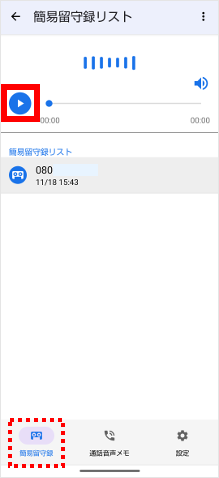 「簡易留守録」が選択されていることを確認し、再生するメッセージの[再生ボタン]をタップします。