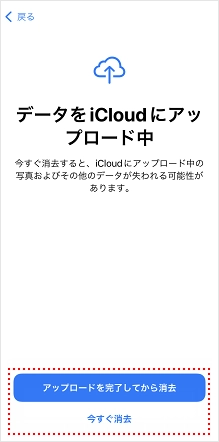 [アップロードを完了してから消去]、または[今すぐ消去]をタップします。 端末の「探す」機能がオフになっていれば、どちらかをタップするとすぐにリセットが開始します。