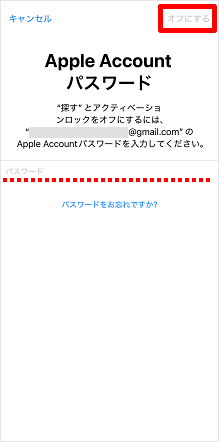 「探す」機能がオンになっている場合は、この画面が表示されます。 オンのままでは初期化ができないため、Apple Accountのパスワードを入力し、[オフにする]をタップします。 「オフにする」をタップするとリセットが開始します。