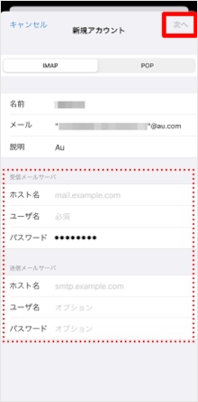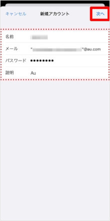 新規アカウント追加画面で以下を設定して[次へ]をタップします。