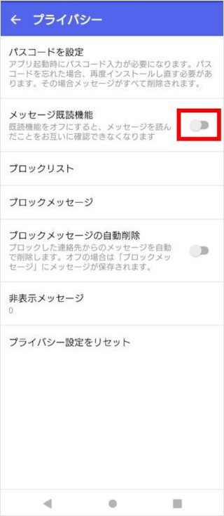 「メッセージ既読機能」のスイッチをタップしてオフにします。