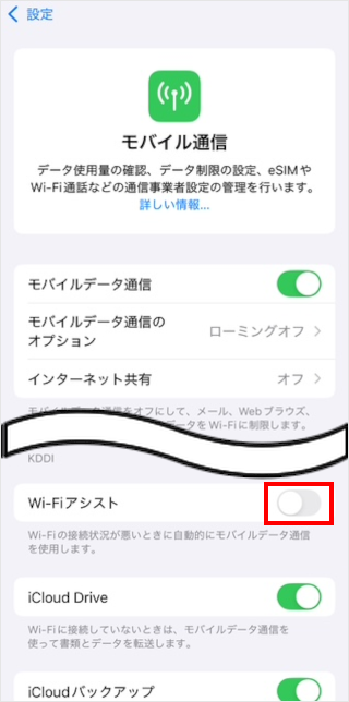 [Wi-Fi アシスト]のスイッチをタップし、オン/オフにします。