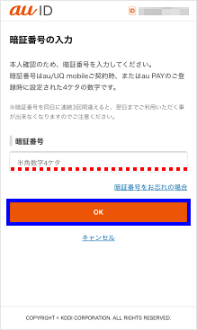 数字4桁の暗証番号を入力し、[OK]をタップします。
