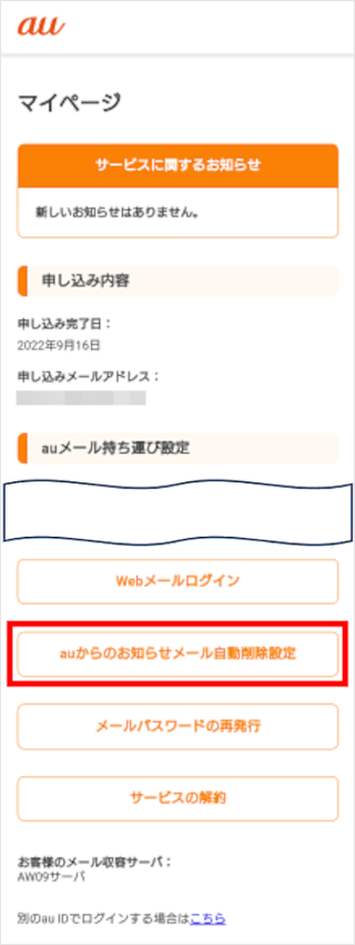 auメール持ち運びサービスで、auからのお知らせメールを自動削除するには、マイページにアクセスして設定を行います。