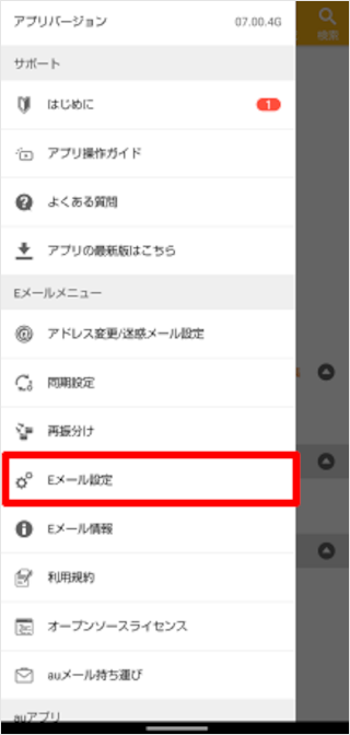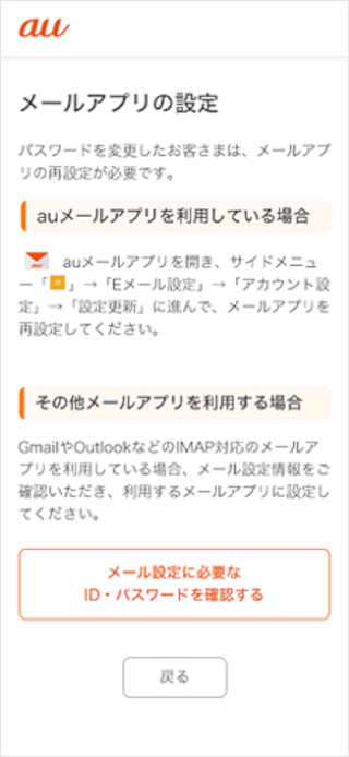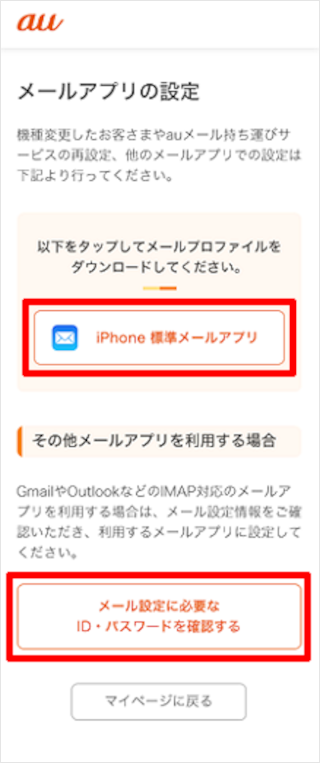 Android:[Android au メールアプリ]をタップします。 Gmail:[メール設定に必要なID・パスワードを確認する]をタップします。