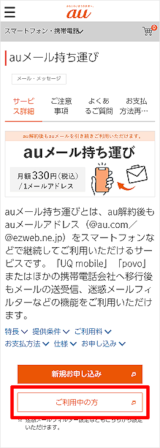 auメール持ち運びページにアクセスします。