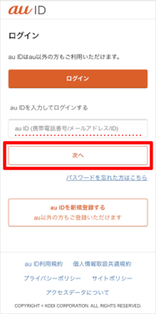お申し込みになるメールアドレスのau IDを入力し、[次へ]をタップします。