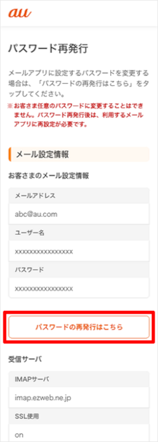 auメール持ち運びサービスのマイページにアクセスすることでメールパスワードを再発行できます。