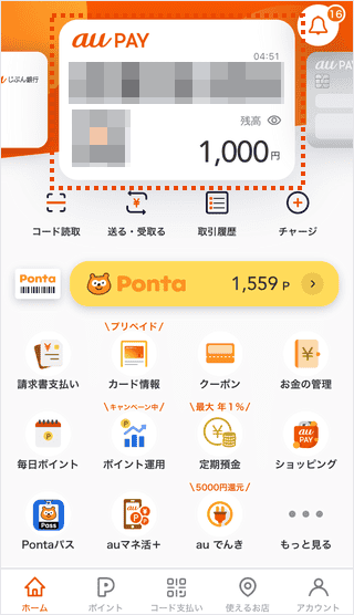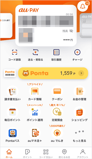 au PAY アプリのホーム画面を表示します。