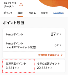 au Ponta ポータルにログインし、「履歴」でポイントの加算予定を確認することができます。