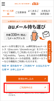 「auメール持ち運び」サービスを継続利用される場合は、支払い方法が有効であることをご確認の上、以下の手順で再申し込みを行ってください。