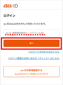 再申し込みするメールアドレスのau IDを入力し、[次へ]をタップします。
