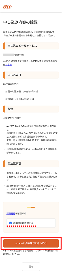 以上で、「auメール持ち運び」サービスの再申し込みは完了しました。