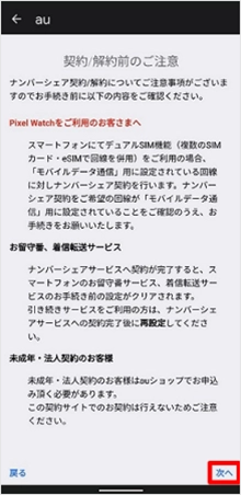 「契約/解約前のご注意」を確認し、[次へ]をタップします。 ※特にデュアルSIM機能をご利用の場合、記載内容をご確認ください。