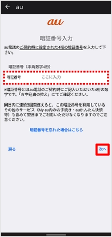 au契約時に設定した4桁の暗証番号を入力し、[次へ]をタップします。
