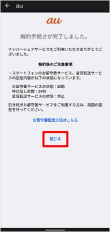 解約手続きの完了です。 [閉じる]をタップすると画面が切り替わります。