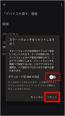 「ダウンロード型SIMの消去」のスイッチをタップしてオンにします。 [リセット]をタップするとペアリング解除は完了です。