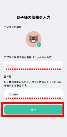 お子さまの情報を入力し、[保存]をタップします。