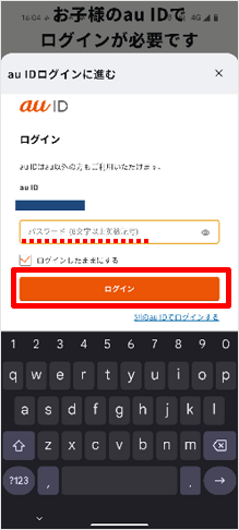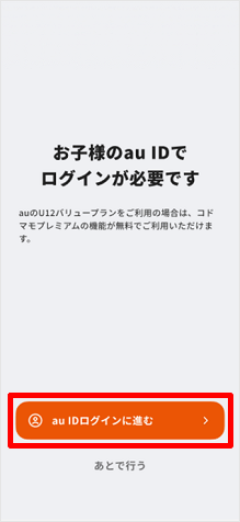お子さまの端末で、[au IDログインに進む]をタップします。 ※手順8~17までお子さまの端末で操作します。