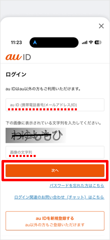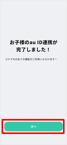 お子さまのau IDと、表示される文字列を入力し、[次へ]をタップします。 ※文字列が表示されていない場合は、au IDのみ入力します。