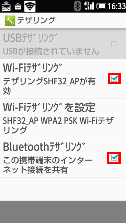 Wi-Fiテザリングにチェックがある場合は Wi-Fiテザリングがオンになっています。